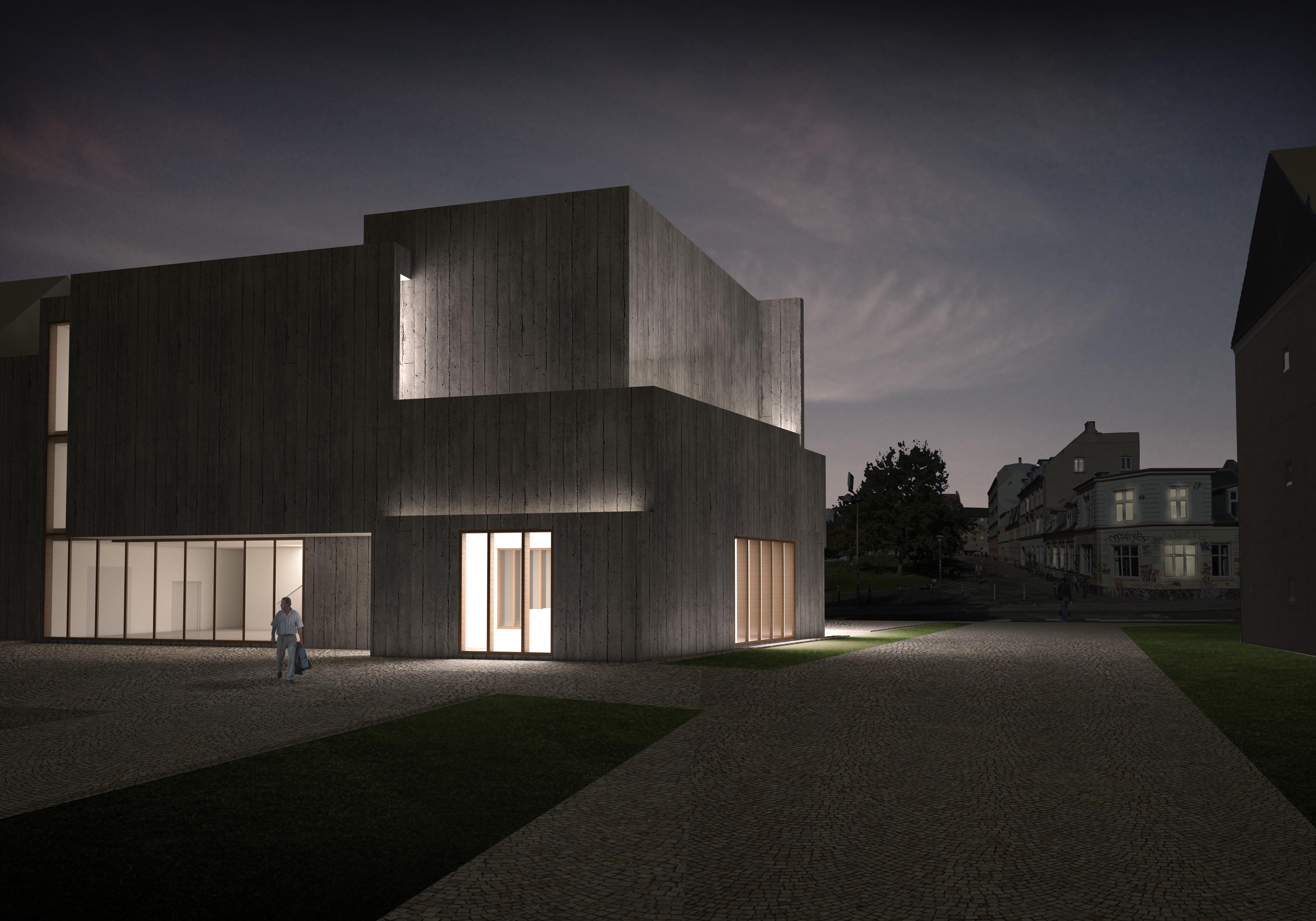 The museum’s exterior is wood casted concrete. The hard concrete is inspired by the hard environment on Norrebro. Inside, the museum offers large gallery space with diffuse over light. All windows directly connected to an exhibition room are directed towards north so that optimal diffuse light for curating art is achieved. In contrast to the concrete and the white interior walls, window frames and details are dark, warm wood.